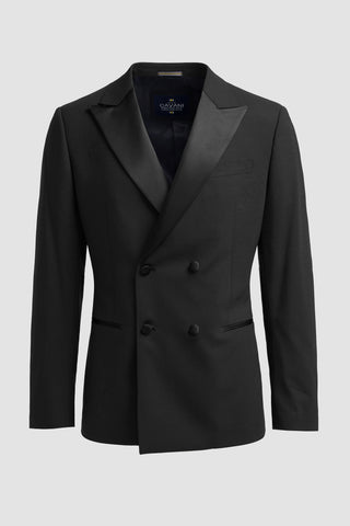 Refined and powerful, the Aspen Black Double Breasted Blazer is the pinnacle of modern sophistication. Its sharp double-breasted silhouette and sleek black finish exude confidence and timeless charm. Perfectly slim fitfor a commanding fit, this blazer transitions seamlessly from black-tie events to polished evenings, ensuring you stand out effortlessly. Shop the look: Shirt | Tie | Trousers | Shoes Size and Fit: 34 – 52-inch chest Model Wears: The model wears a size 40 Regular and is 6 foot 2 inches tall with a, 40 inch chest, 32 inch chest and 16 inch collar. Product Comp & Care: 43% Wool 55% Polyester 2% Lyrca | DRY CLEAN ONLY