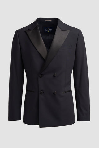 Sophistication meets modernity with the Aspen Midnight Navy Double Breasted Blazer. Its slim fit silhouette, rich navy hue, and sharp detailing exude effortless elegance. Perfect for formal occasions and refined evenings, this blazer ensures a commanding presence, combining timeless design with contemporary flair for the discerning gentleman. Shop the look: Shirt | Tie | Trousers | Shoes Size and Fit: 34 – 52-inch chest Model Wears: The model wears a size 40 Regular and is 6 foot 2 inches tall with a, 40 inch chest, 32 inch chest and 16 inch collar. Product Comp & Care: 43% Wool 55% Polyester 2% Lyrca | DRY CLEAN ONLY