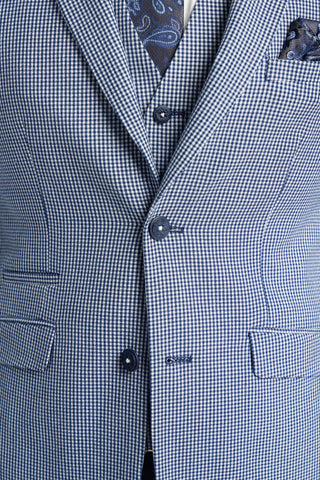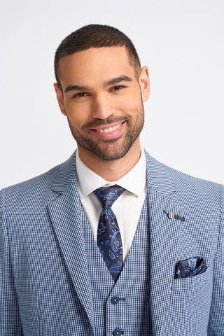 The Baresi Three Piece Suit captures modern sophistication with its unique play on contrast. A refined blue check blazer and waistcoat meet deep navy trousers, creating a striking balance of style and substance. Crafted from lightweight fabric, it’s tailored for all-day comfort and perfect for any occasion demanding timeless confidence and charm.Â