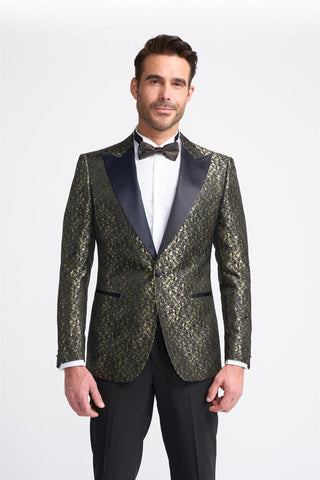 The Toros Gold Blazer exudes opulent sophistication with its intricate gold detailing and sleek black satin lapels. Designed for the bold and stylish, this statement piece is perfect for black-tie events and upscale soirées. Elevate your eveningwear with timeless glamour and undeniable presence. A blazer that commands attention. Shop the look: Shirt | Tie | Trousers | Shoes Size and Fit: 34 – 52-inch chest Model Wears: The model wears a size 40 Regular and is 6 foot 2 inches tall with a, 40 inch chest, 32 inch waist and 15 inch collar. Product Comp & Care: 100% Polyester | DRY CLEAN ONLY